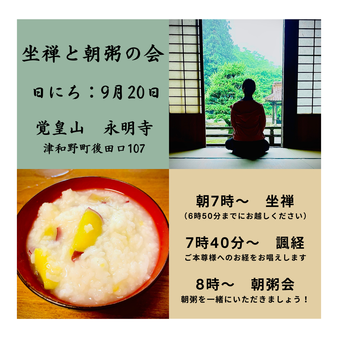 公開日: 2025/8/31 最終更新日: 2025/8/31 【坐禅と朝粥の会】9月は以下の日程で開催します。日にち:9月20日時間:朝7時~(6時50分頃にお越しください)9月の朝粥は「秋を先取り!サツマイモ粥」を炊きます。お楽しみに~!!